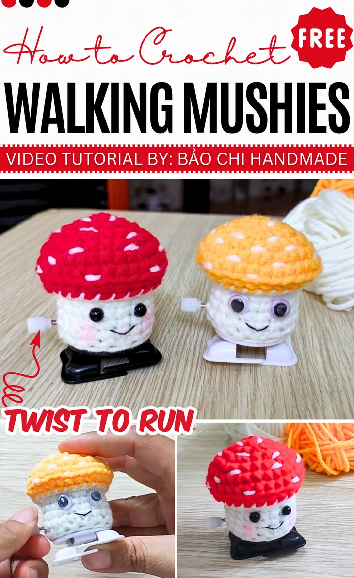 Crochet amigurumi are no longer non-interactable and static, at least, not for fall. So, with a stitch-by-stitch tutorial, learn how to crochet this mini walking mushroom with a twist-to-run option. You can easily find a store-bought walking legs toy insert, and you can choose from simple safety beads and googly eyes. To crochet one of these two mushroom mushies, it will take no more than 30 – 45 minutes, and there is no need for any other stuffing. Whether its a toddler or a kid, this crochet walking mushroom amigurumi is so fun to play with.
