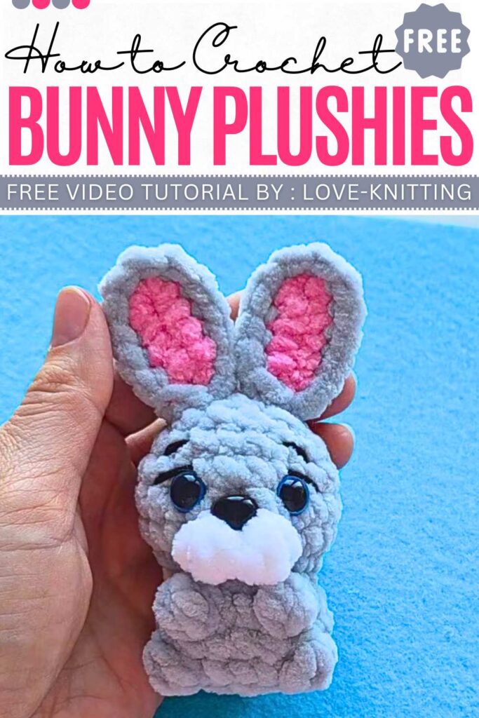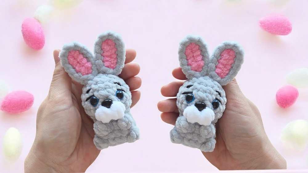 Learn how to crochet a no-sew, small, and cute bunny plushie that can sit. You will crochet the tail, legs, arms, and a muzzle, using plush yarn. The pattern also involves making separate ears by crocheting two parts and joining them together.