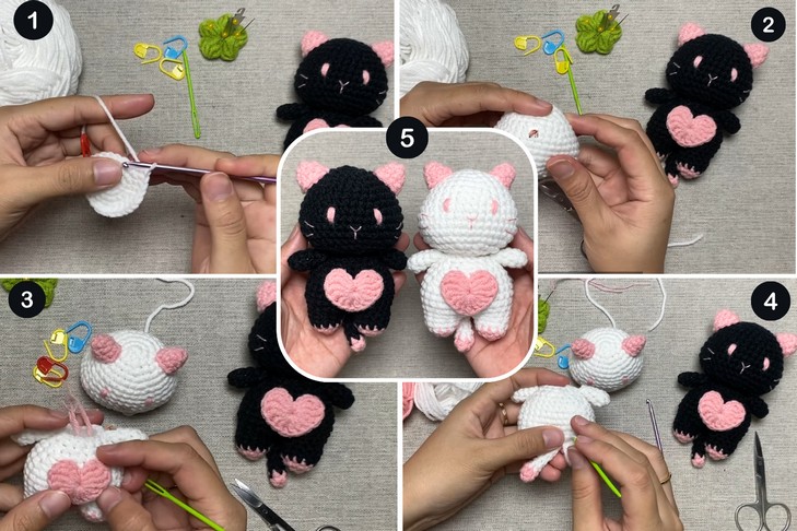 Slip stitches to join rounds or finish off a piece. For the heart, the designer uses chain stitch, treble crochet, slip stitch, and double crochet stitches. Embroider the whiskers, eyes, and nose of the cat amigurumi dolls.