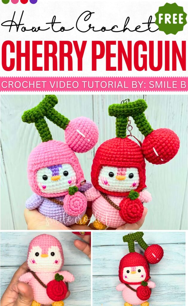 This is a long tutorial on how to crochet a detailed penguin amigurumi doll with the cherry accessories. The penguin wears a little crossbody flat cherry bag and a headgear.
