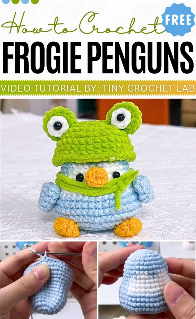 This cute crochet chubby penguin looks oh-so cute with the googly frog hat and yarn scarf. The body of this amigurumi penguin is no-sew. Instead of the belly patch, this amigurumi penguin features the eye patch.