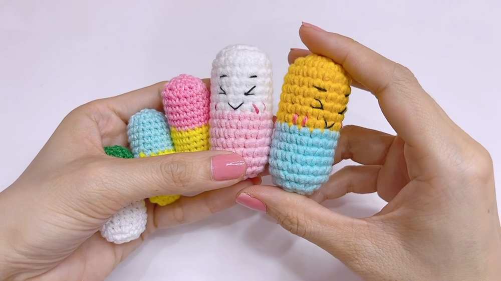 The designer behind this pill amigurumi is @NITKA_KZ – she has quite a good grasp on kawaii amigurumi designing with added cuteness and surprises. More patterns for fun toys like this one: