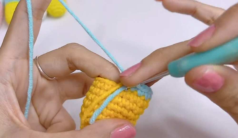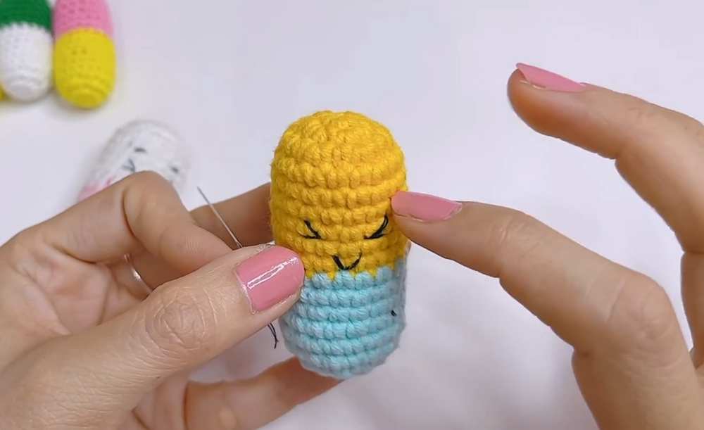 - Eyes: Using black thread, embroider two small horizontal lines or “V” shapes about 3 rows above the color change line.