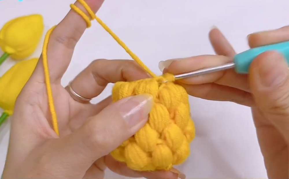 - Closing Round: Ch 1. Sc in the spaces between puffs. (8 sc).