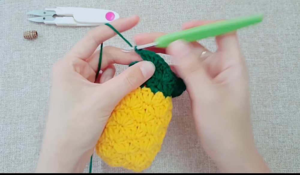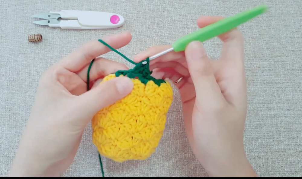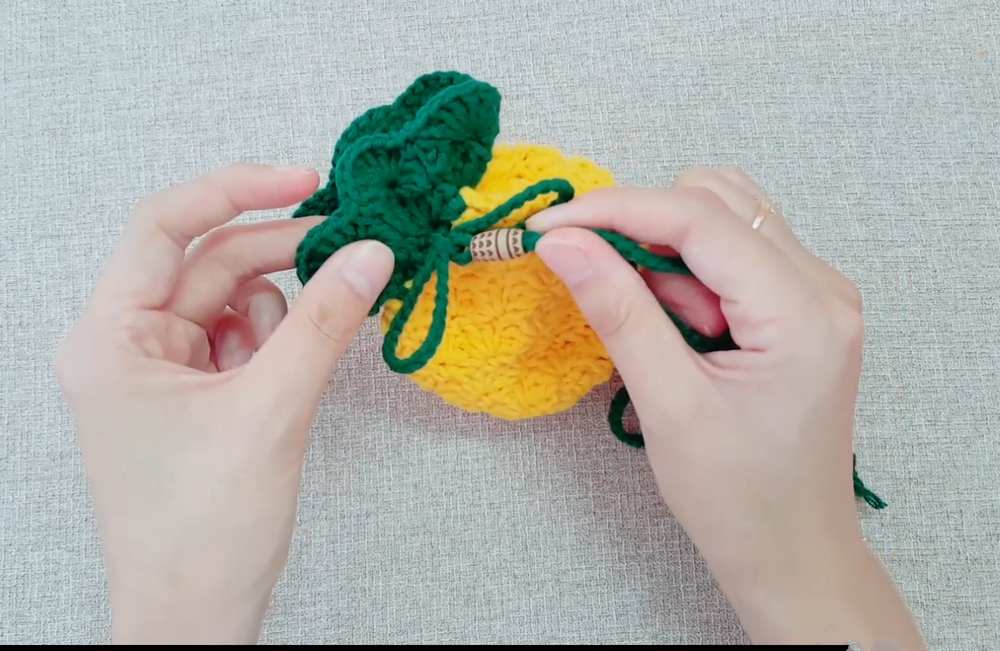 - Threading Drawstring: Take the green chain (drawstring). Thread it in and out through the spaces between the shells of the final yellow round (R5), directly underneath the green leaves.