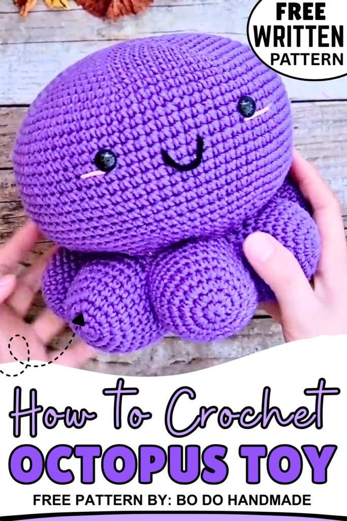 This pattern shows you how to make a large, cuddly crochet octopus. What makes this version special is that it is made of several different parts joined together to look like a big, friendly sea creature. It is quite big when finished, measuring about 22 cm wide, making it a perfect handmade gift or a soft decoration for a room.