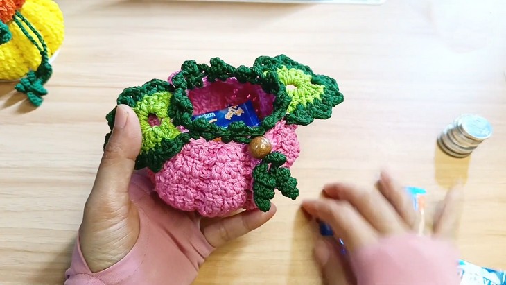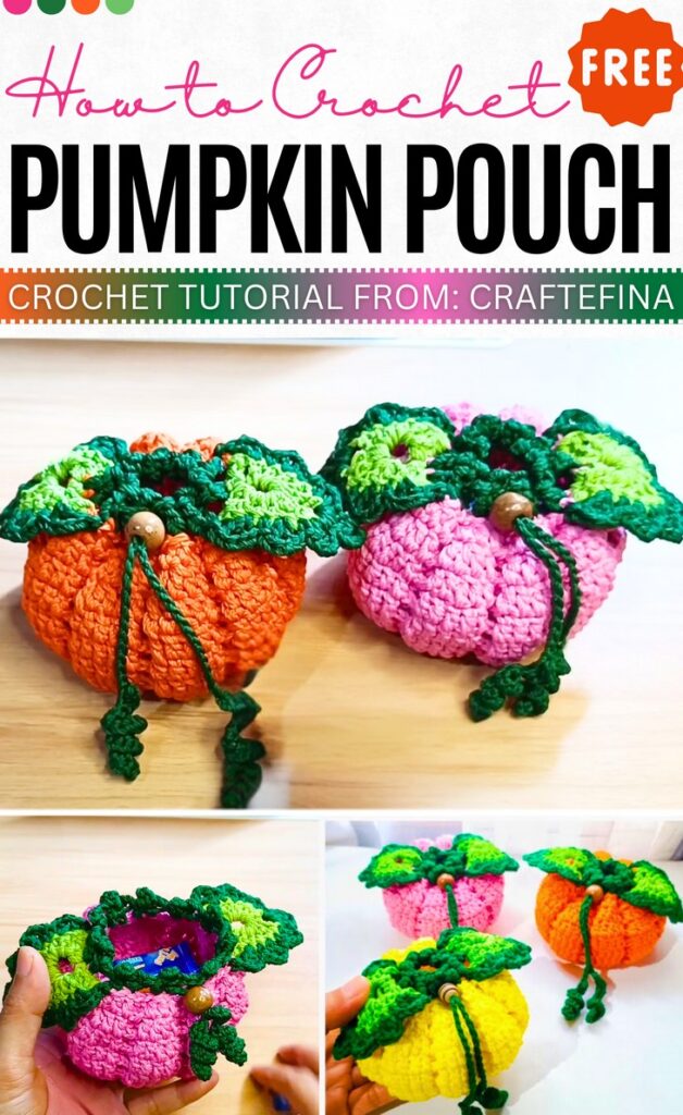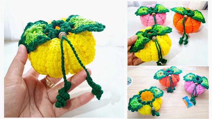 Personalization Tips: The project is so complete that you may not need any additions, but the tutor has suggestions. Choose from orange, pink, and yellow pumpkin colors. You can also stuff the pouch and create a home decor for the Thanksgiving table. The leaves seem a bit large, which you can reduce by decreasing the number of rounds.