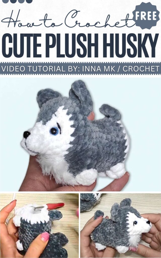 So, you are good to go for following this crochet tutorial. You will end up with a cute, chubby husky puppy plushie with a fuzzy yarn belly, blue eyes, and low-sew construction.