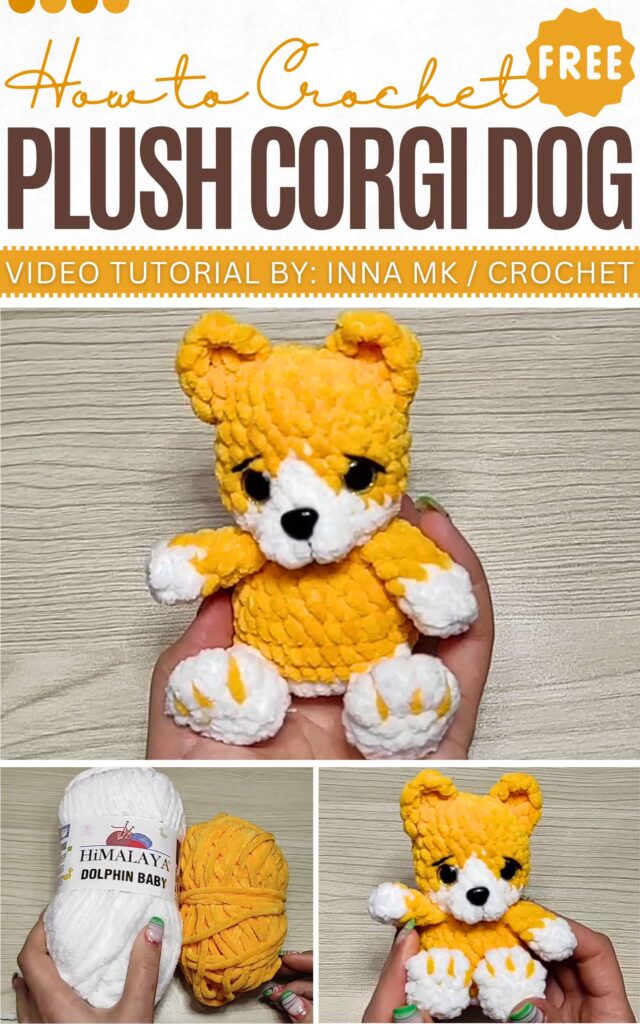 The construction of this crochet corgi puppy plushie is similar to the previous crochet dog. Except you will have to work with two colors of yarn and make a less puffy muzzle. This cute corgi plushie will make a 12 cm buddy for a toddler.