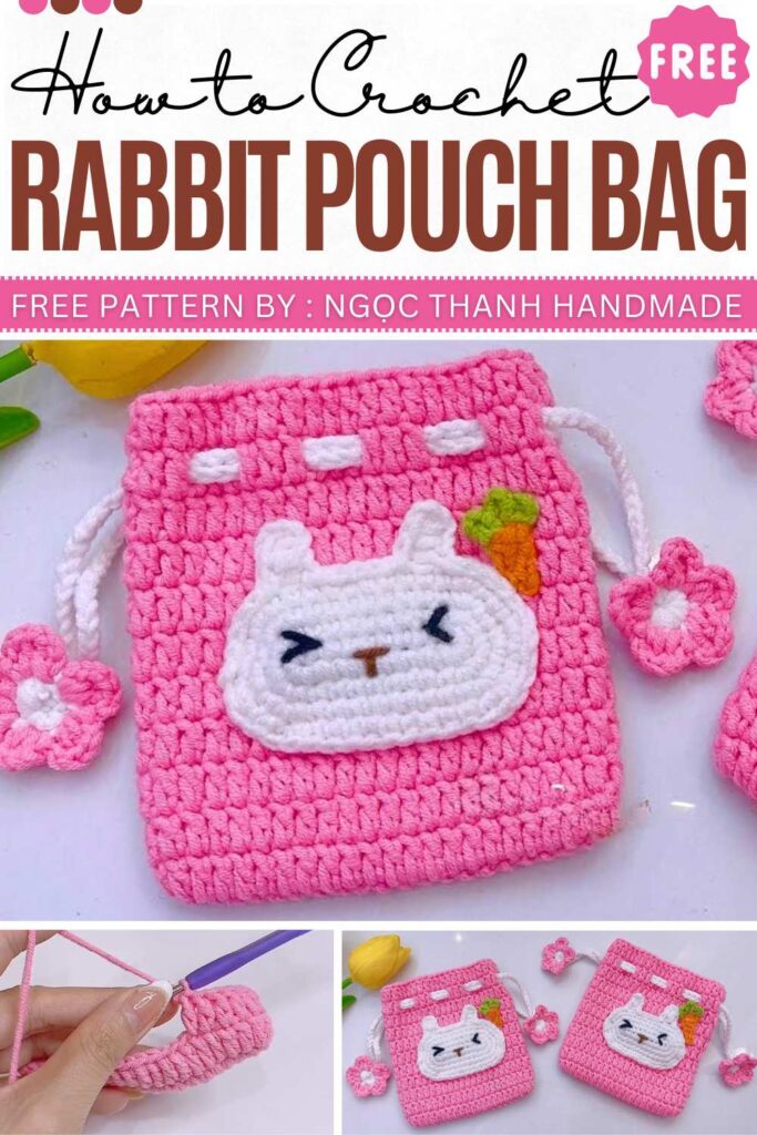 This crochet tutorial provides instructions for a rabbit-themed drawstring pouch, including a decorative rabbit face and a small carrot charm.