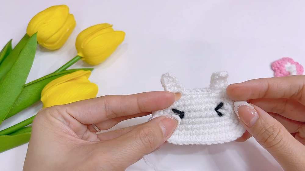 Ear 2: Ch 6, skip 2 ch, work 3 htr. Sl st 4. - Finishing: Embroider a “V” shape for eyes with black thread and a “T” shape for the nose and mouth with brown thread. Sew the face onto the bag starting at round 4.