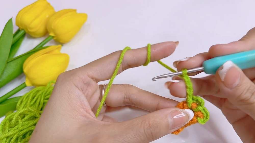 - Leaves (Green): Attach green yarn to the top. (Ch 4, sl st into base) repeat 3 times to create three leaf loops.