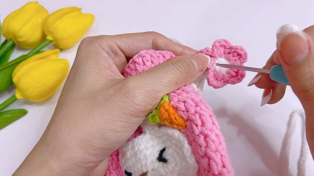 - Petals: Attach pink yarn. (Ch 2, 1 dc (US) / 1 tr (UK) in same stitch, 1 dc (US) / 1 tr (UK) in next stitch, ch 2, sl st in same stitch) Repeat around to form petals.