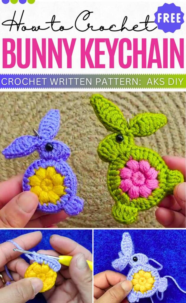 This bunny keychain features granny round flower motifs and is perfect for gifting, as it’s both unique and colorful. For the ears, follow the leaf pattern, and for the motif, the sunburst sunflower pattern in two colors. Then work around this motif to crochet the feet and the head.
