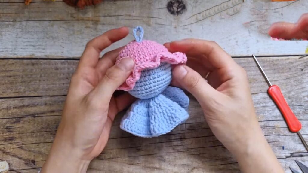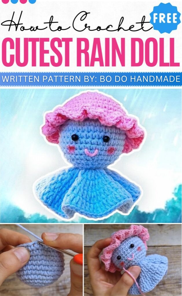 Here is the crochet pattern for a traditional Japanese “rain praying” doll. These dolls are unique because they are meant to be hung by windows to bring good weather and stop the rain. This specific version is extra cute because it wears a little colorful hat with a wavy brim, making it look like a tiny person wearing a raincoat.