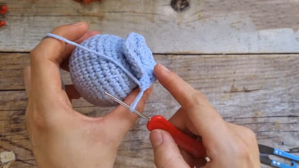Fasten off, weave tail through remaining 6 sts to close hole. Note: The front loops of R17 will be used for the body.