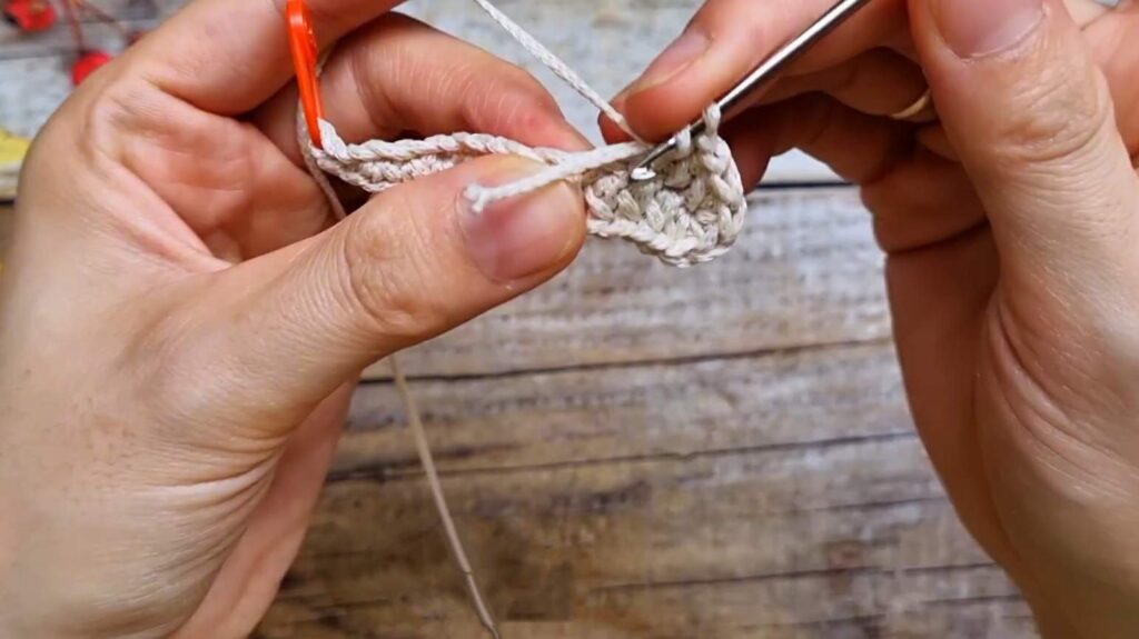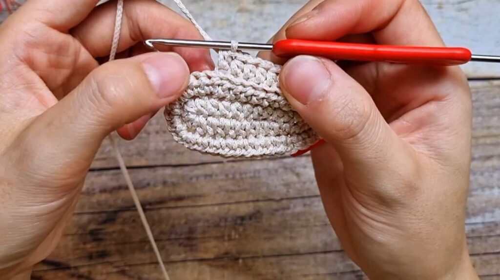 R1: Starting in 2nd ch from hook: 3 sl st, 3 sc, 8 hdc. In the last ch: 5 hdc. Rotate to work on other side: 8 hdc, 3 sc, 3 sl st. [33 sts]