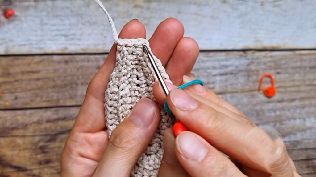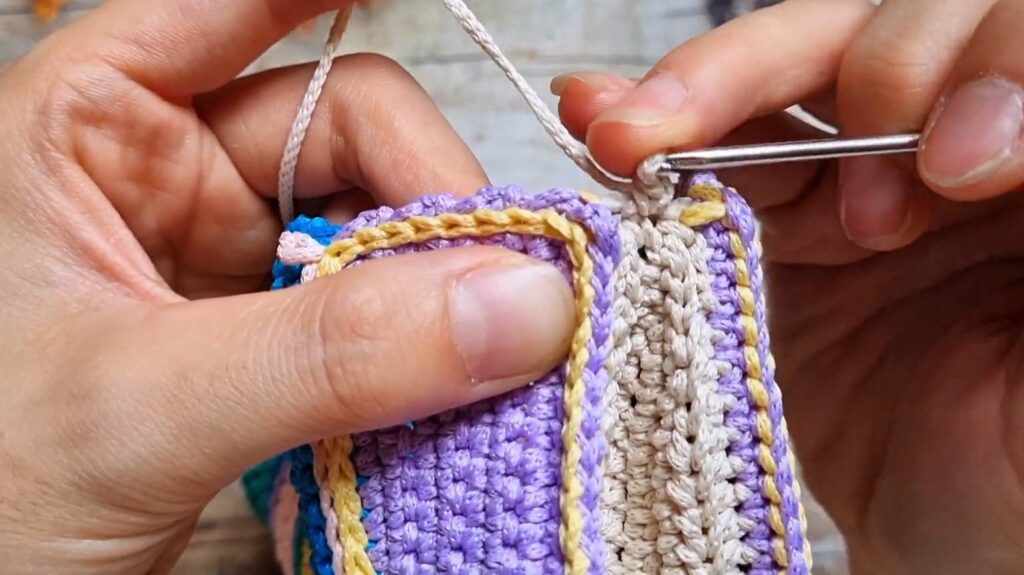 Surface Sl St: Attach accent yarn to the “valleys” between color changes. Work surface slip stitches across the width for the raised ribbing effect.
