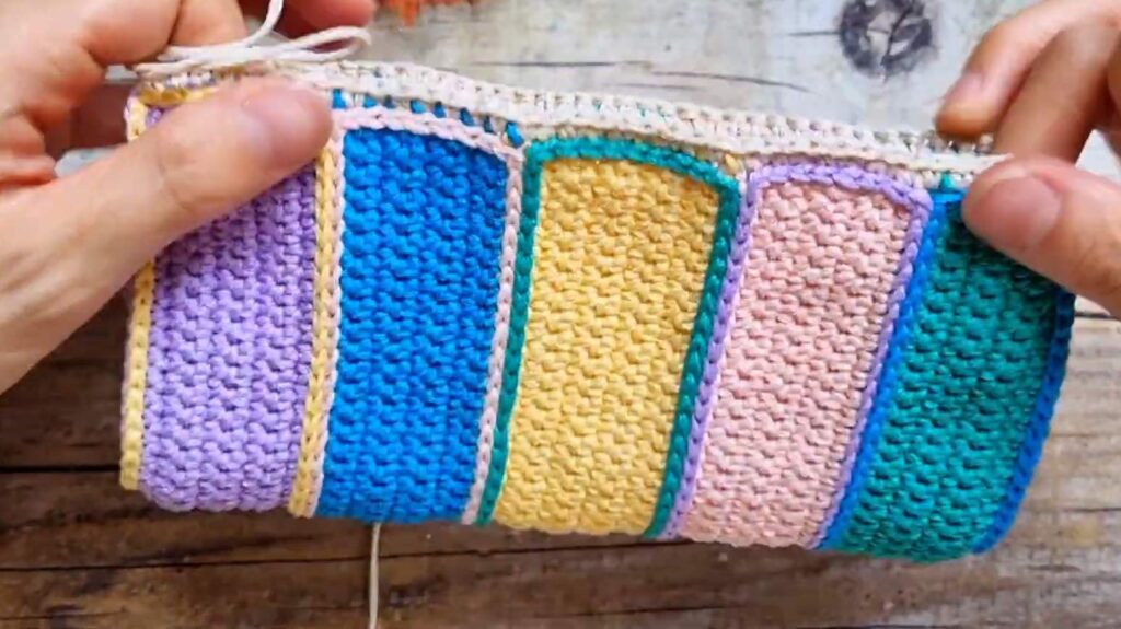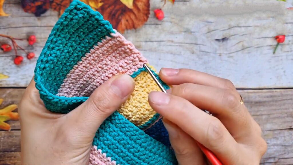 Colors 2, 3, 4 (Blue, Green, Yellow): Work 8 rows of sc for each color.