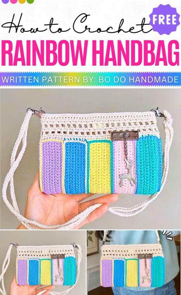 This Rainbow Handbag is a bright and happy bag that looks like a beautiful rainbow. With beautiful color stripes it is enough to complete your attire. It is a medium-sized bag for your phone, wallet, or small toys. The bag is a great for anyone who loves bright colors and wants a unique, handmade accessory to wear.
