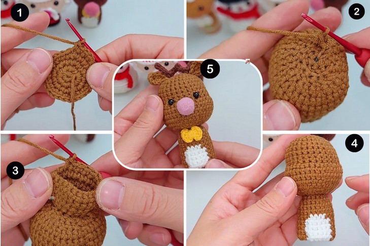 Here is a tutorial for the third and cutest version of crochet Christmas puppet characters by Hui Crochet! So, learn how to crochet this low-sew, mini, and kawaii reindeer finger puppet ornament that will be an irresistible gift idea. This reindeer finger doll is the most well-designed version of Christmas puppets by Hui, featuring a large head and fingerless body, and finished with a yellow bow tie, pink pom-pom, and even a white belly. You will also learn how to crochet the antlers super easily. You will be able to complete crocheting this puppet by yourself within 30 minutes, thanks to the easy pattern.
