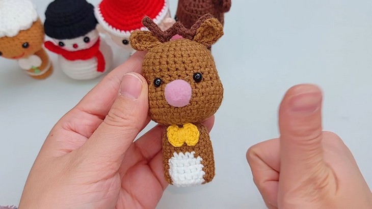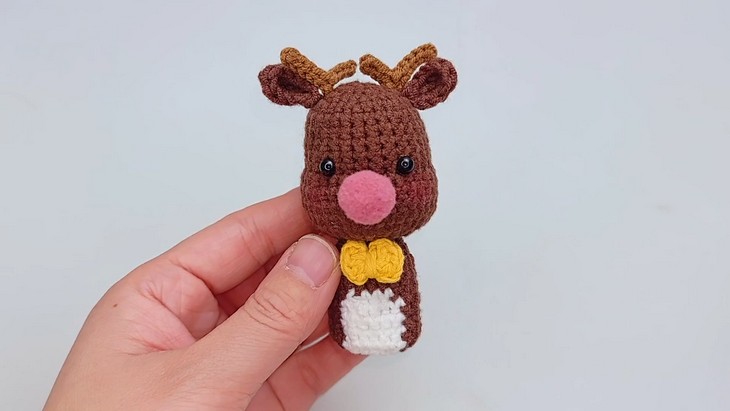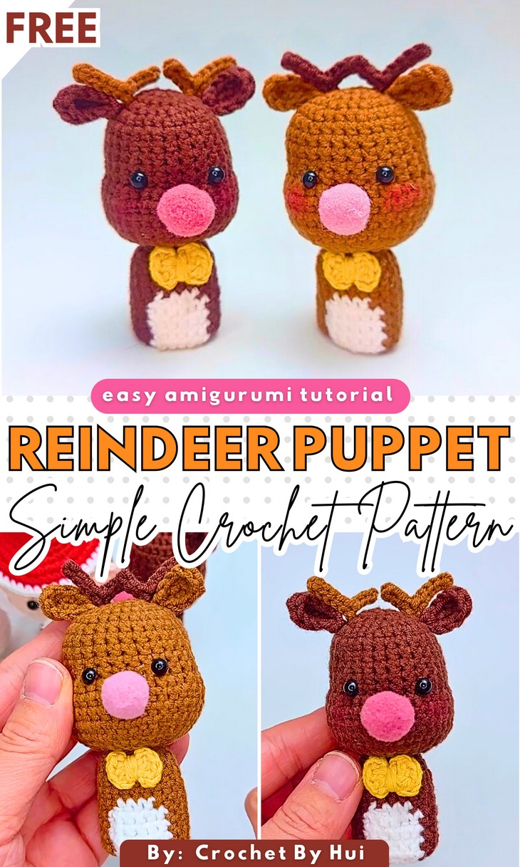 Here is a tutorial for the third and cutest version of crochet Christmas puppet characters by Hui Crochet! So, learn how to crochet this low-sew, mini, and kawaii reindeer finger puppet ornament that will be an irresistible gift idea. This reindeer finger doll is the most well-designed version of Christmas puppets by Hui, featuring a large head and fingerless body, and finished with a yellow bow tie, pink pom-pom, and even a white belly. You will also learn how to crochet the antlers super easily. You will be able to complete crocheting this puppet by yourself within 30 minutes, thanks to the easy pattern.