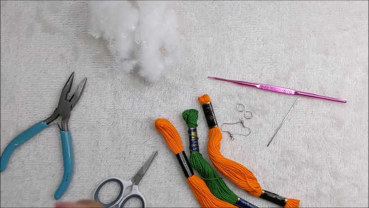 The following are the crochet materials and tools that the tutor uses for crocheting this pumpkin amigurumi earrings set: