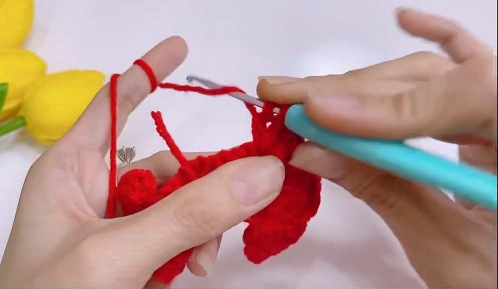 Wrap the Stem: Wrap the green yarn around the wire stem. About halfway down, hold the leaves against the stem and wrap the yarn around their tails to secure them to the stem. Continue wrapping to the bottom and secure the end with glue.