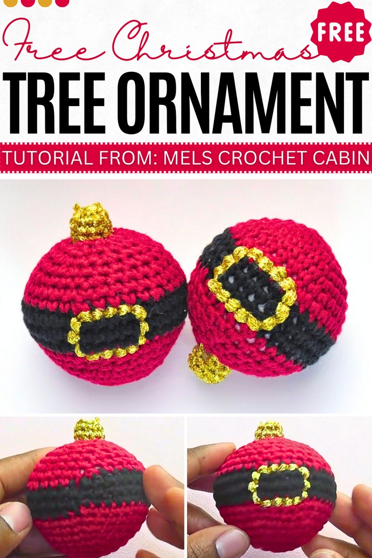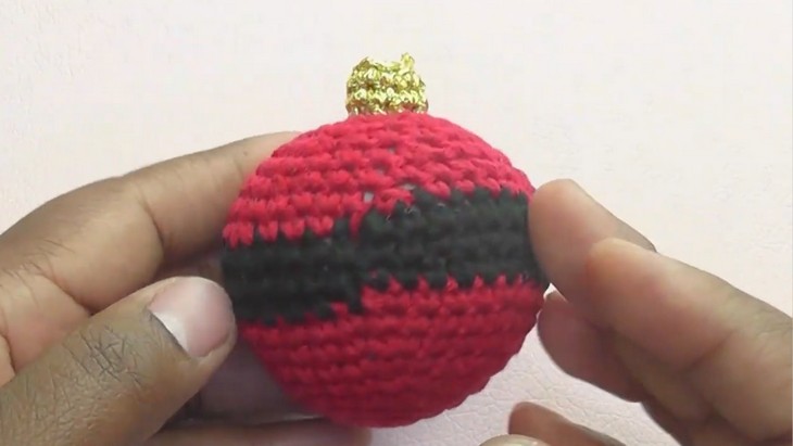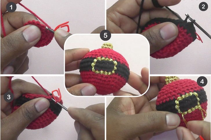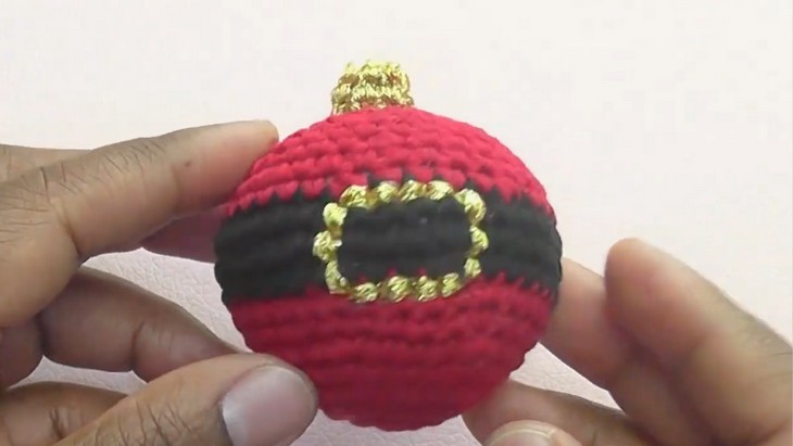 Quick Summary & Skill Level: Beginner. The crochet Santa belly ball base is simply crocheted sphere using single crochet, increase, decrease, chain, and slip stitch. Stripe work using color changes is needed for the mid black section, the Santa belt pattern (red to black and back to red).