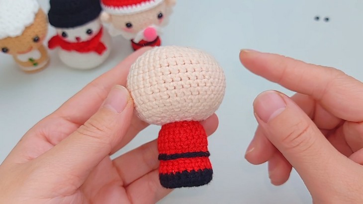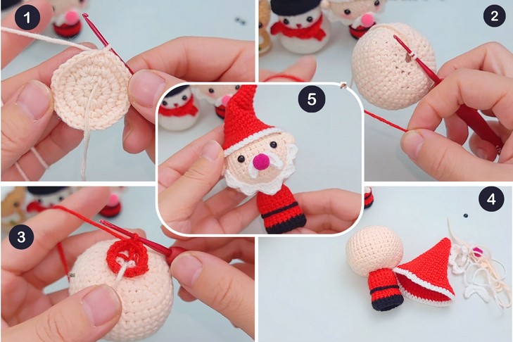 Personalization Tips: Instead of small pom-poms for the crochet Santa doll, you can crochet a simple bobble stitch or use a small white faux fur piece for the top of the hat. The hat can also be decorated with embroidered snowflakes or beads. Use the red for the nose as it matches better instead of the pinkish.