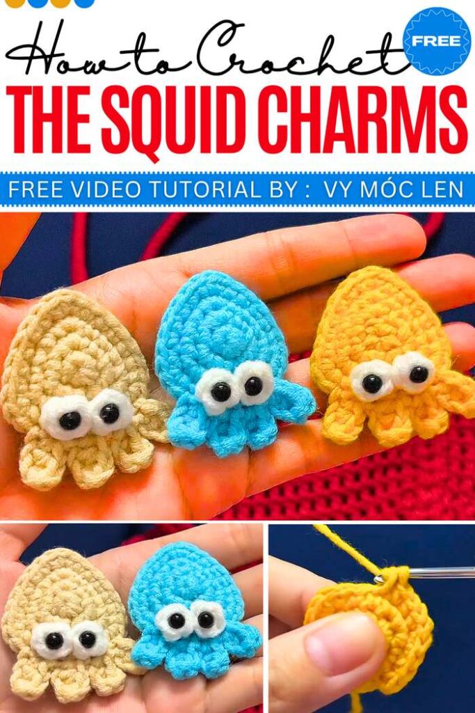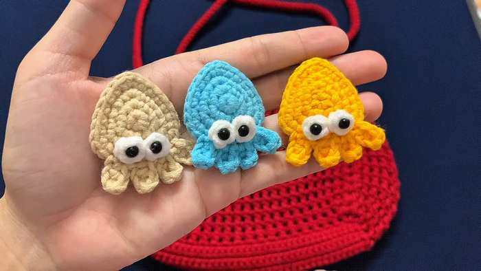 If you’ve got a lot of scrap yarn lying around, this little squid is the perfect way to clear it out. It’s a flat, stylized charm rather than a bulky stuffed toy, giving it a cool, modern look that’s great for summer bags or keychains. The wide, expressive eyes take up most of the body, which gives it a quirky personality that really stands out.