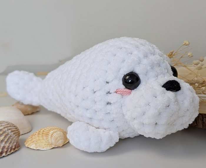 To make it, start with a magic ring for the head and work in rounds, narrowing the shape as you reach the tail. The snout is crocheted separately with extra increases for an oval look and then sewn between the safety eyes. You’ll also need to make two flat flippers for the front and two leaf-shaped pieces that join at the back to form the tail, finishing with a little black embroidery for the nose.