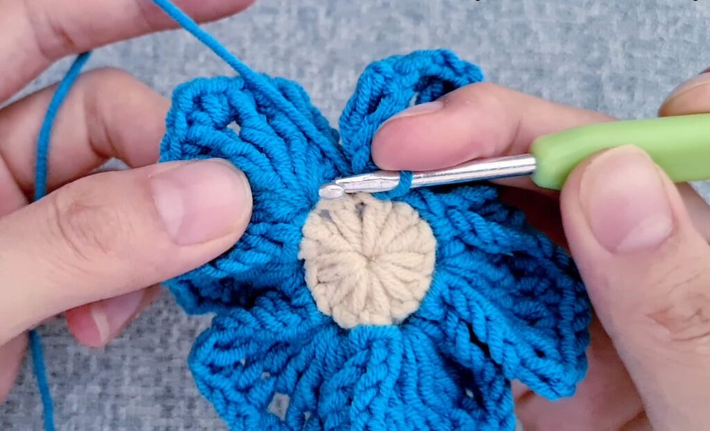 After the 6th petal, ss into the first stitch of the first petal to close the round.