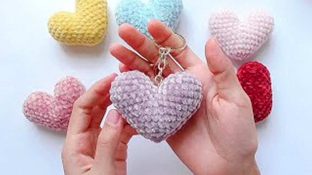 The plush heart is my favorite version of a crochet heart. This one needs the velvet yarn in any color, but that one should not be super bulky to get a small crochet heart. It will be a nice and bright keychain.