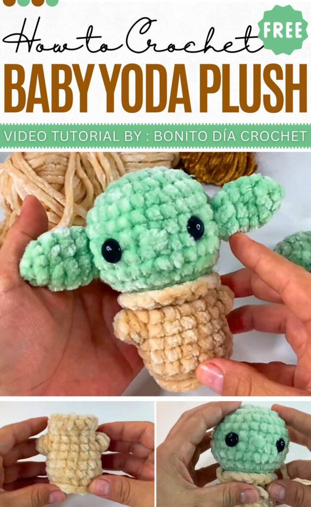 I added this crochet Baby Yoda plushie for the ease of crocheting and the quick construction. You will crochet a simple no-sew mini Baby Yoda plushie using the velvet yarn. This baby Yoda is Chibi as the head is quite larger than the cloaked body of baby Yoda.