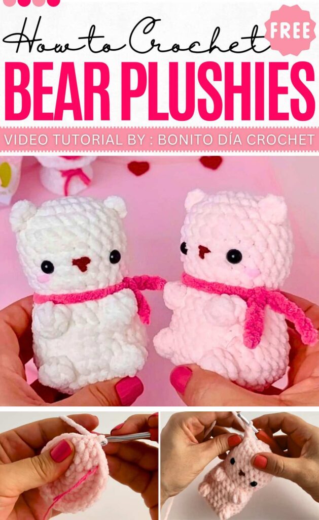 As a love present, learn how to crochet a no-sew mini bear plush with a crochet scarf and flat base. It is super quick to crochet and can be crocheted in either white or pink. You don’t have to crochet the scarf, but wrap a strand of pink super bulky yarn around.