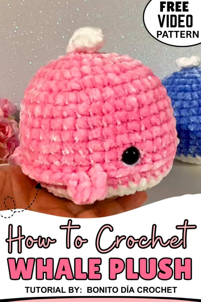 For summer, crochet this chubby whale plushie using chenille yarn with cute kawaii eyes. It will also make an irresistible snuggle and desk buddy while you are working on a large crochet project. Use round plastic kawaii eyes on both sides.