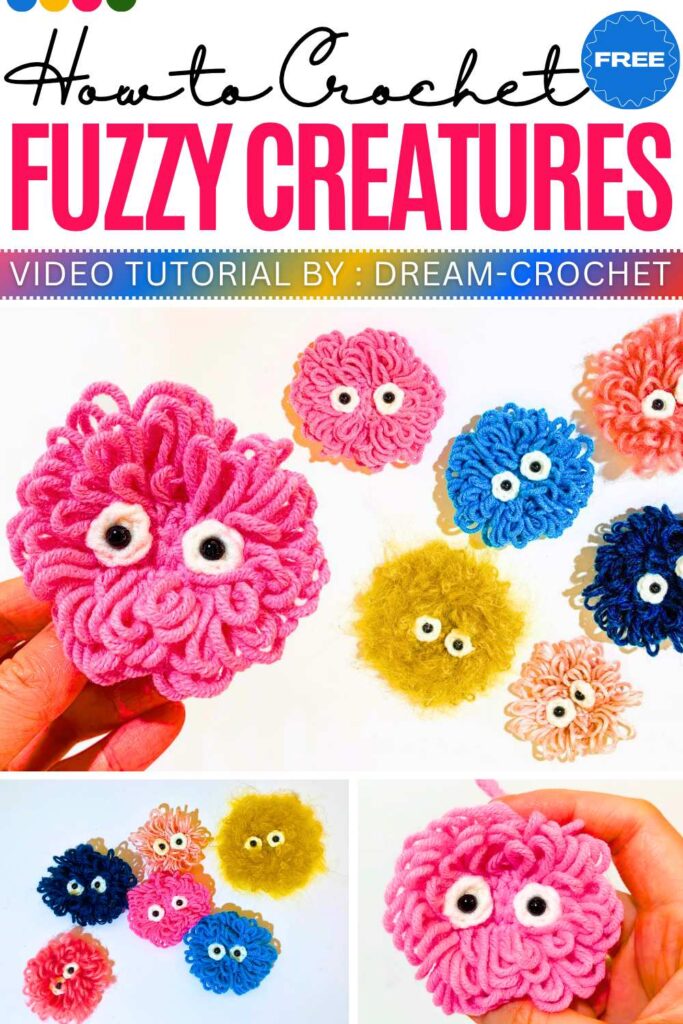 Start with a small circular base and use loop stitches to create a shaggy, fuzzy texture. Crochet a long chain at the top for the hanging loop. To finish, make two white circles for eyes, glue them on, and add black beads in the center for a cute face.