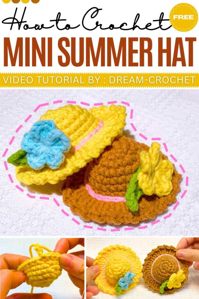 This Crochet Mini Summer Hat is a tiny and sweet accessory that looks just like a classic sun hat. This quick project is perfect for using up small scraps of yarn and makes a great gift or a cute decoration to hang on your bag or keys.