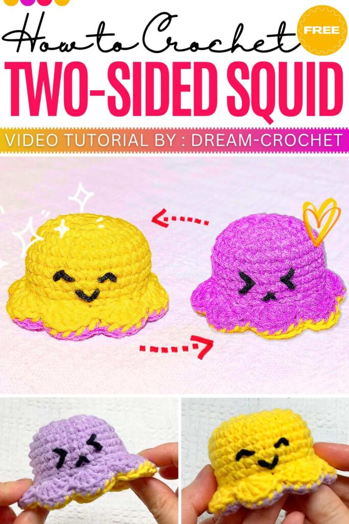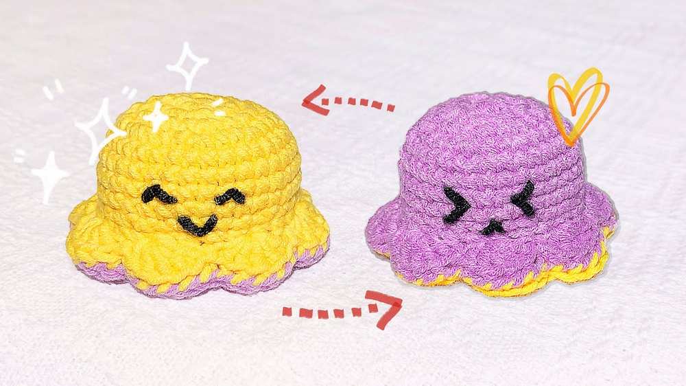 To make it, crochet two identical squid bodies in different colors, starting with a rounded top and adding small wavy tentacles at the bottom. Once both are finished, place one inside the other and sew them together along the bottom edge, leaving enough room for the bodies to flip back and forth. Add a happy face to one side and a different expression or color to the other to complete the reversible look.