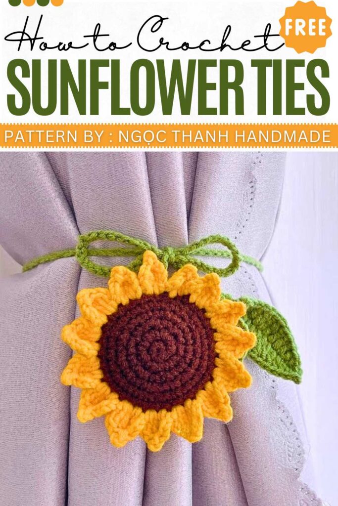 This summer and spring, learn how to crochet an elegant sunflower tieback for curtains with a long tie and leaf strings. This sunflower tie has a stuffed centre with 15 flat petals. You can also use the big flower crocheted with yarn to make a sunflower for a vase by adding a yarn-wrapped craft wire.