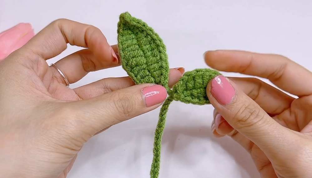 - Skip 2 sts on the main tie rope from the large leaf base. Attach green yarn.