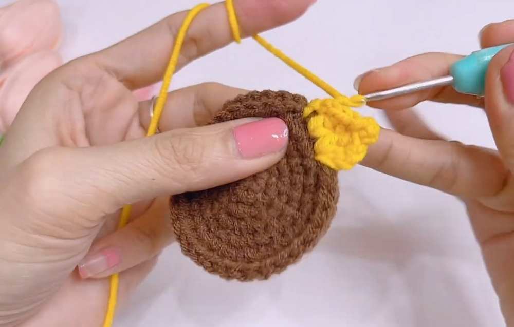 - Petal Construction: Join the yellow yarn through both layers. Work the petal sequence into the edges. Each petal spans two stitches of the brown base. Ensure the picot tip of the petal is created by slip stitching back into the top of the first treble crochet.