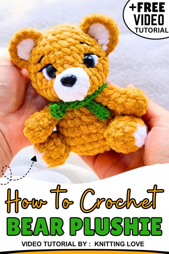Here is another tutorial to crochet a baby teddy bear plushie with innocent, large eyes. The tutor has posed this plush bear sitting and also crocheted a small scarf in green. I am especially in love with the detail of the eyes of this, with the white part, eyelashes, and eyebrows, too.