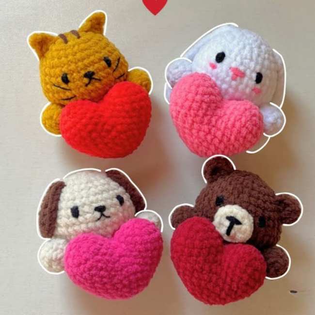 This tutorial offers a versatile “base pattern” to create four distinct animals—a cat, bear, bunny, and puppy—each customized through different ear shapes and colors. It stands out by featuring a unique hugging pose where the animal holds a large, separately crocheted heart. The design is highly adaptable, including specific embroidery for different muzzles and the option to add a crochet hanging loop for use as a keychain or car charm.
