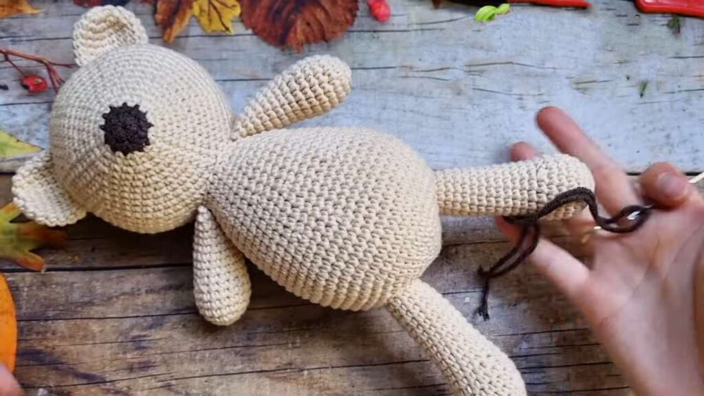 R22–R29: Decrease 6 sts per round (e.g., R22: 8 dc, dec) x 6. Stuff firmly.