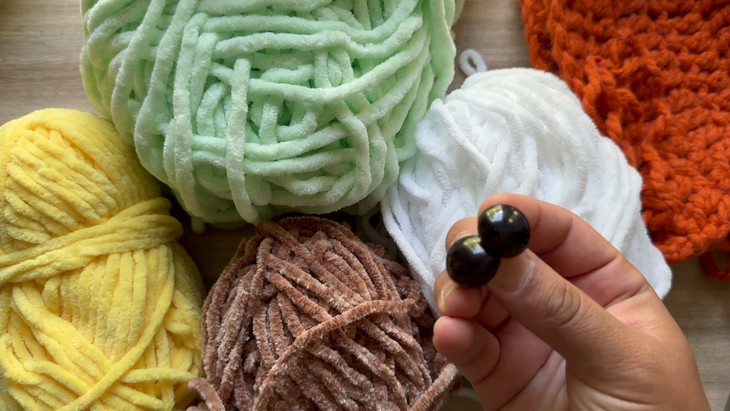 - Yellow, orange, white, green, and brown yarn. Plush yarn is recommended, but Lion Brand’s “thick and quick” yarn is also suggested.