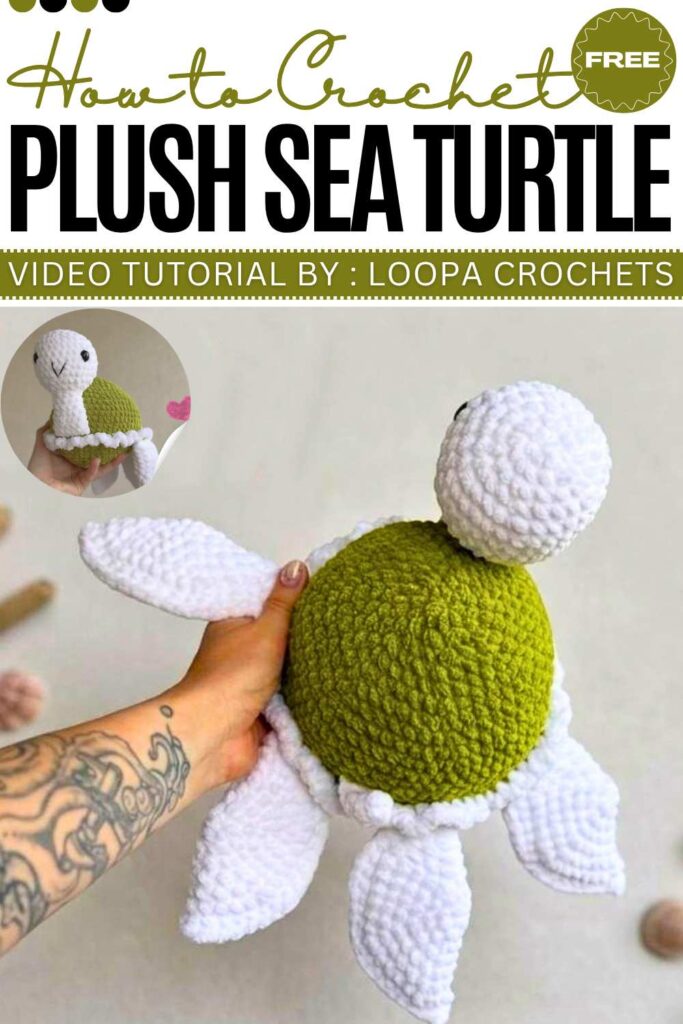 This Crochet Plush Sea Turtle is a soft amigurumi project made with bulky velvet yarn, giving it a squishy, high-quality feel. The design has a large, domed green shell and contrasting white fins and head. All this makes it a perfect gift or nursery decor item.