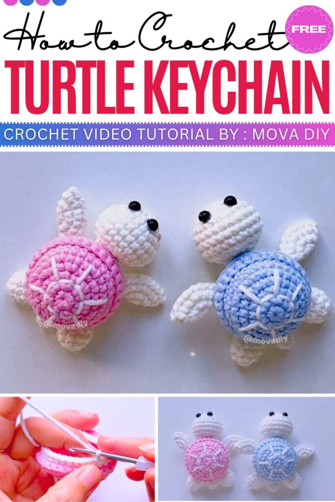 Crochet a pink dome for the shell, finishing with a front-loop rim. Attach white yarn to the back loops to crochet the underbelly, then stuff and close. Separately crochet and stuff a head, four legs, and a tail, then sew them to the shell. Add safety eyes and a keychain loop to finish.