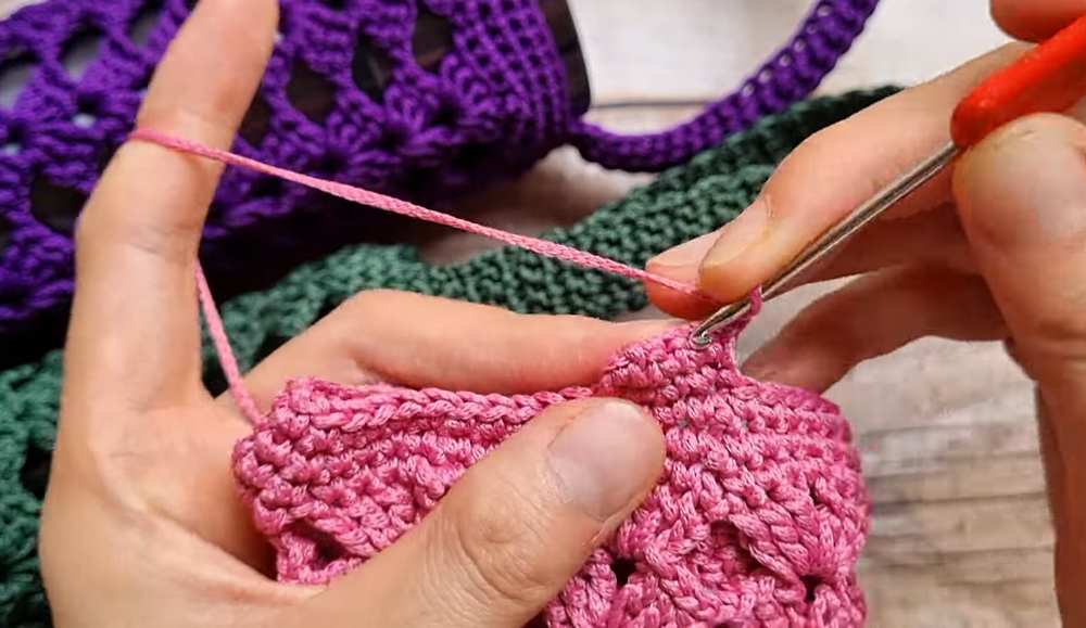 Alignment: Fold the bag rim flat to find the exact opposite point of the handle’s starting side. Count the stitches to ensure the handle is centered.